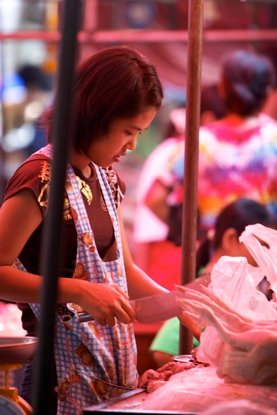 I grabbed my camera from the hotel and hit the road. I walked a few blocks to the famous Patpong market area, which is flanked by sex bars on all sides. Seedy con artists harass you aggressively at every step to just come in and have a look. Prostitutes call from the sides, trying to strike up a conversation. The garish neon signs and generally dirty atmosphere, combined with the gaudy T-shirt and souvenir stands made for some interesting images. Normally, the con artists will follow tourists (myself included) for blocks, trying to entice them into the strip clubs with a relentless torrent of “What you look for? Many girls! They do anything! Free to look!” But tonight, because of my super secret Thai uniform, they mostly ignored me. If any of them came close, I showed them the camera and said, “You want picture?” which would make them back away slowly.