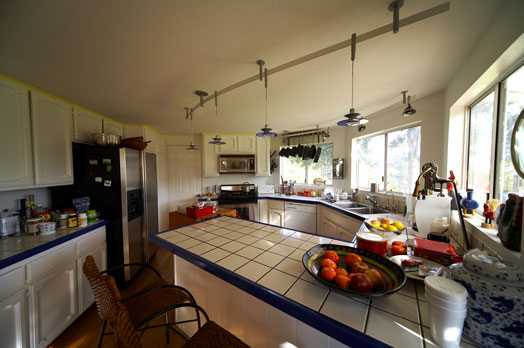 Of course, being Thoms, we went immediately for lunch. We had some pretty exotic Taiwanese food. After lunch we went to Wayne’s, where I met my new camera for the first time. I love it. It works just like a 10D but better and faster. The LCD screen on the back looks huge. There are no delays waiting for the camera to turn on, or for the photos to be written to the card. The other thing I love is that I can zoom in my RAW files to check focus. There was some kind of limit on how far you could zoom in on a 10D, but they’ve fixed that. The files are huge though. I can only fit 60 RAW files on my 1GB card. I’m still trying to decide if I can live with that. Here’s a little test shot of Wayne’s kitchen.
