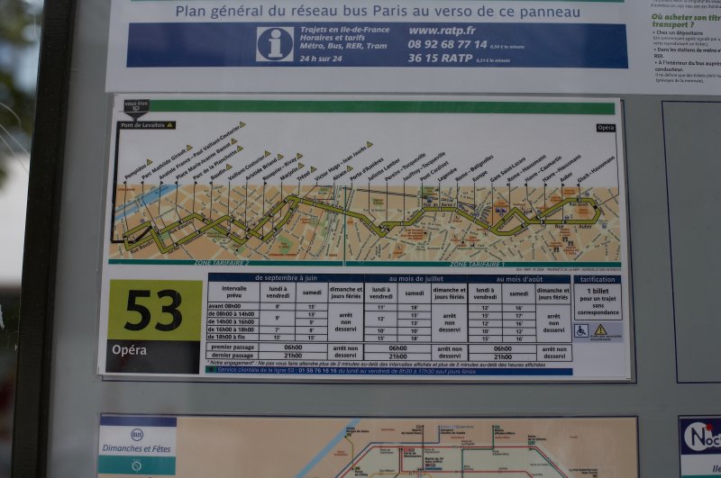 I read DinyÂs requests for bakery and bus stop photos, and since it was an easy mission, I accepted it. I snapped the bus stop photo at Pont de Lavallois, then stopped off at the Louise Michel Metro station and popped over to the bakery to take a picture. The woman working at the counter was so flattered that I wanted her to be in the picture that she didnÂt know which way to turn. I heard her saying something about being in the newspaper, but I didnÂt really know how to tell her that nothing that exciting was going to happen. The bus stop photo is thumbnailed because I made it big enough to read. I doubt anyone else but Diny is interested though 😛