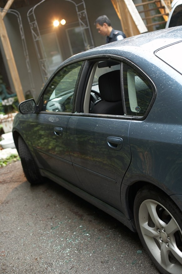You can see the forensics officer going all CSI on Emeril in the background. They took some digital pictures, but didn’t dust for prints. The other cop said I didn’t want them to dust for prints because it makes a “fucking mess.” I probably won’t hear anything more about this, even if they catch the guy. The cop described him as a “crackhead nobody.” I felt really fortunate that I had brought all of my camera equipment and laptop in for the evening so I could work on the photos in the morning. Otherwise, all of the festival photos would have been lost, and I’d have some major headaches replacing the camera gear through insurance. As you can see, though, my shirts got a bit stomped by the perp as he went through the car looking for valuables. In the end, I lost about $5 in change, and had to pay $270 to repair the window.