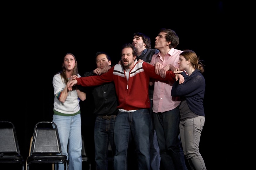 Big in Japan performed last night at the Artscenter. Because it was a Thursday night show, the crowd wasn’t big… maybe 50-75 people in the 300 seat venue. But they were loud and appreciative, so we got great energy from them. I really enjoyed our set. Our suggestion was “catastrophe” and we spun that theme out in many different ways. KPR took some photos of our set. Here’s my favorite… we’re birds dying of avian flu. 😛