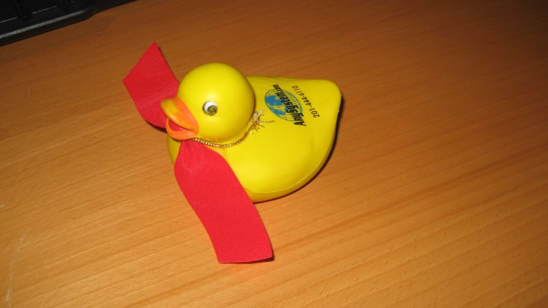 Basically, you whip the rubber ducky at the other guy across the room, preferably when he’s not looking. With any luck, he might hear the whistling of the red aerodynamic ribbons around the ducky’s neck a split second before it smashes into his computer monitor or head.