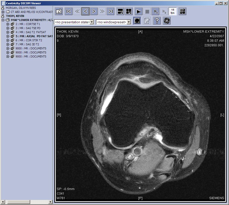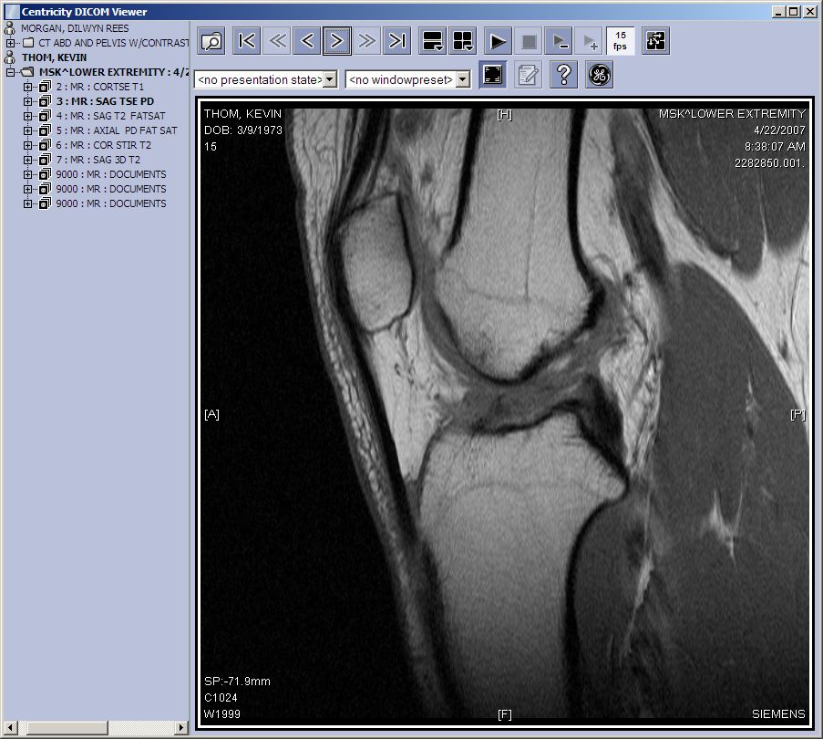So I had my appointment with the sports medicine specialist today. Before I got there, I went to the hospital to pick up my MRI scans on CD. The disk is pretty cool. It runs an application that lets you step through all the “slices” of the MRI like a movie. There’s no doubt about it. My ACL is wrecked, and I’ve got a torn miniscus too. I think you can see the damage in this picture.