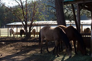 We drove out to the coast again. After hours on Interstate 5 and then smaller highways weaving through the stubbly, clear-cut hills, it was a relief to see the Pacific again when we reached Newport. We quickly found a room at the Shilo Inn, which had a fabulous view overlooking Newport’s enormous beach. From our room, we could see a few people, tiny as ants, traversing the vast expanse of sand, bordered between a scrubby hill and the gentle surf. I completely failed to get a photo of this. So, I present, instead, some horses from the previous morning at the treehouse place.