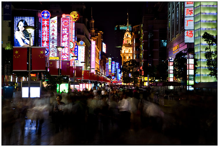 Afterward, I headed down to East Nanjing Road, which is a seemingly endless, neon-encrusted mall floating upon a boiling sea of consumers. This frenzy of consumerism makes Times Square look like a convenience store. Through the heart of this was a long line of Communist Chinese flags, set out to commemorate the 60th anniversary of the founding of the People’s Republic. Those flags, adorning this, the most capitalist place I’ve ever experienced, created a fascinating contrast even in a country that’s seemingly made of juxtapositions.