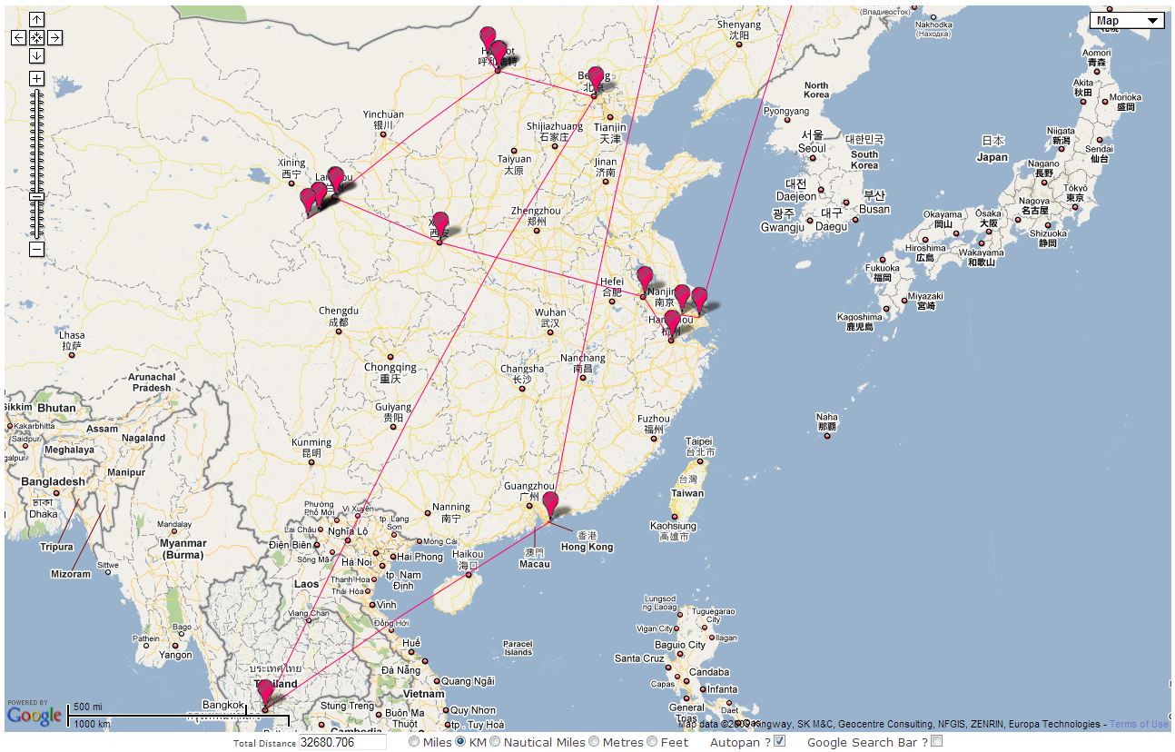 I found a website that calculates distances on Google Maps. I thought this might be a cool way to visualize the my trip to China.