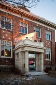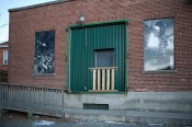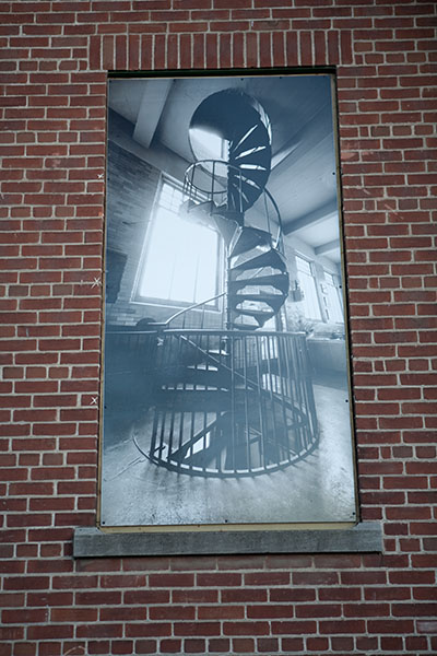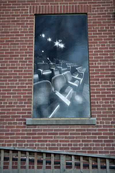 It was fun to go into the Staircase to shoot the interior. The place has tons of character. Capturing that character and the elements that define it was a challenging and enjoyable experience. I wanted to find just the right angle on that black iron staircase that gives the theatre its name. After a few weeks of consideration, we finally selected three images from the day’s proofs, and sent them off to the sign shop. These big mounted posters went up on the windows a couple of weeks ago. Here’s what they look like installed.